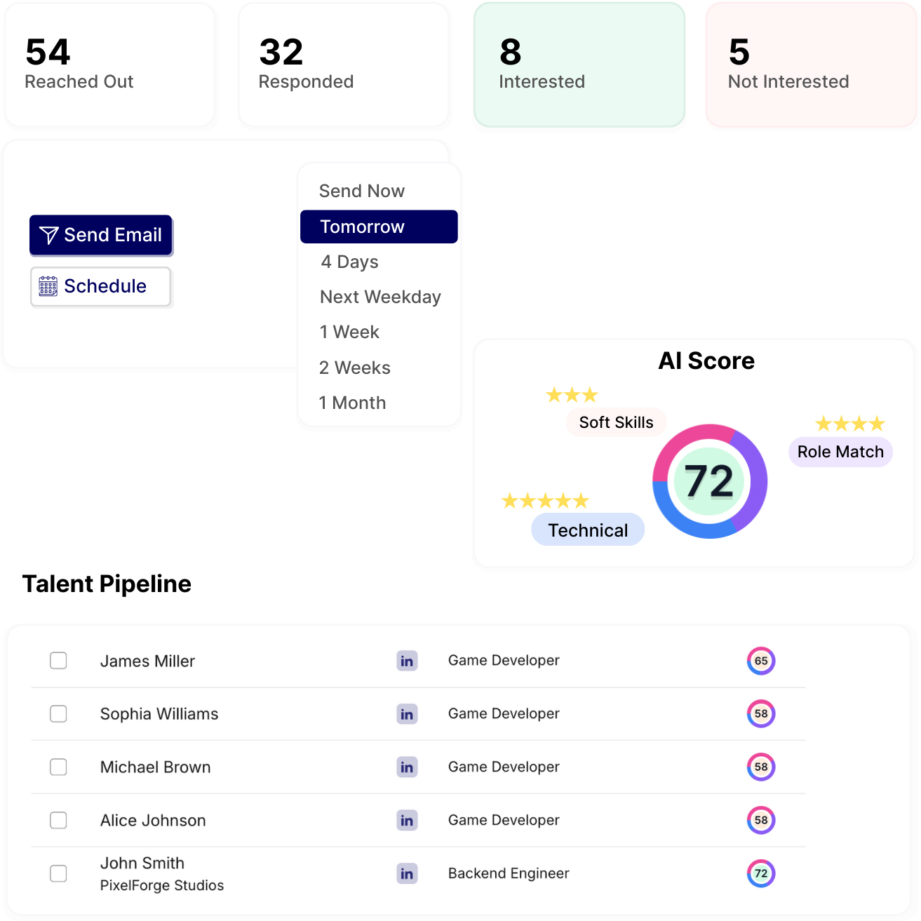 Plan and schedule emails in advance, stay organized with your candidate communication, and keep relationships warm over time - so you always have talent ready to engage when new roles open.