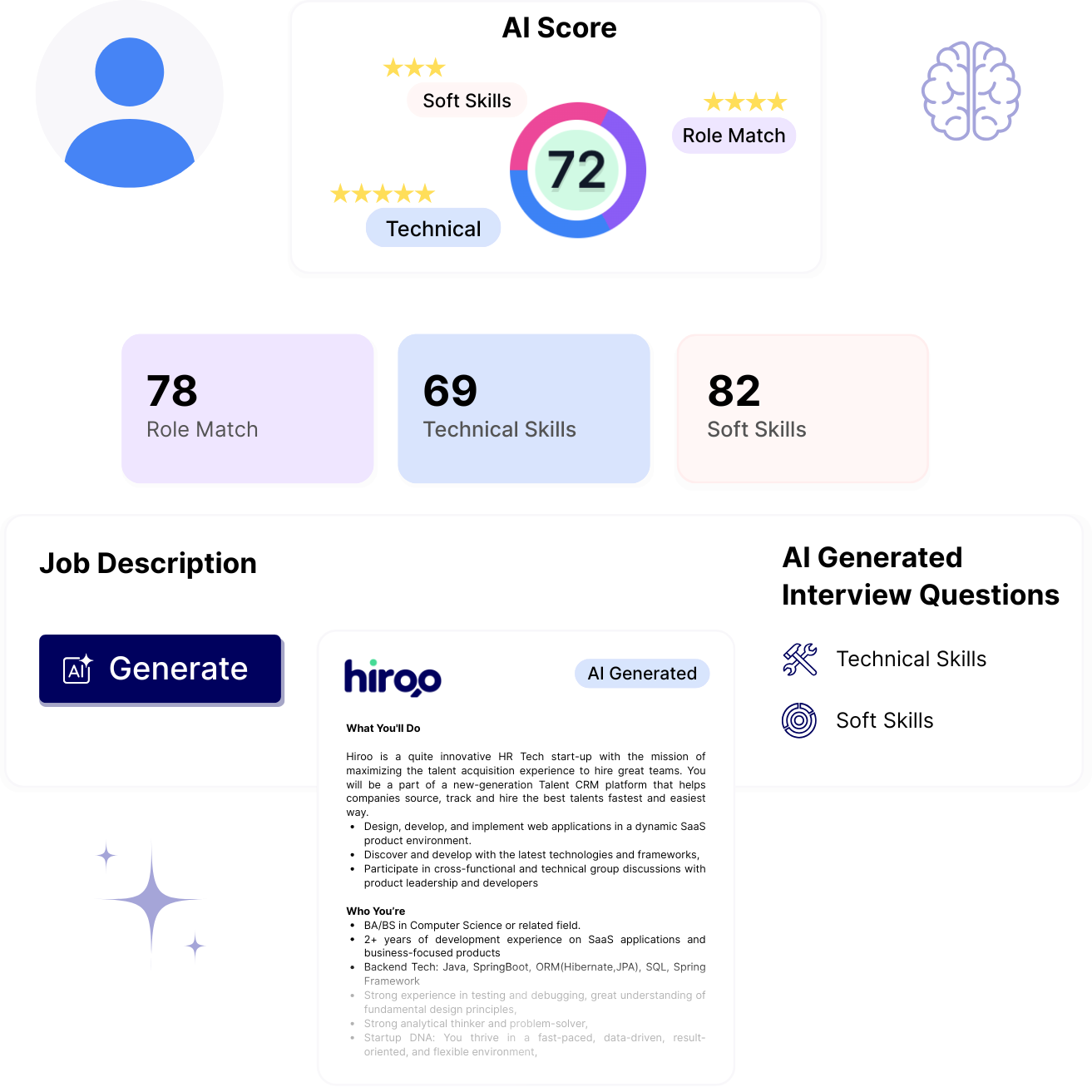 With Hiroo AI, get in-depth scoring that breaks down candidate fit, generate job descriptions and interview questions instantly, and run assessments - all in one platform.