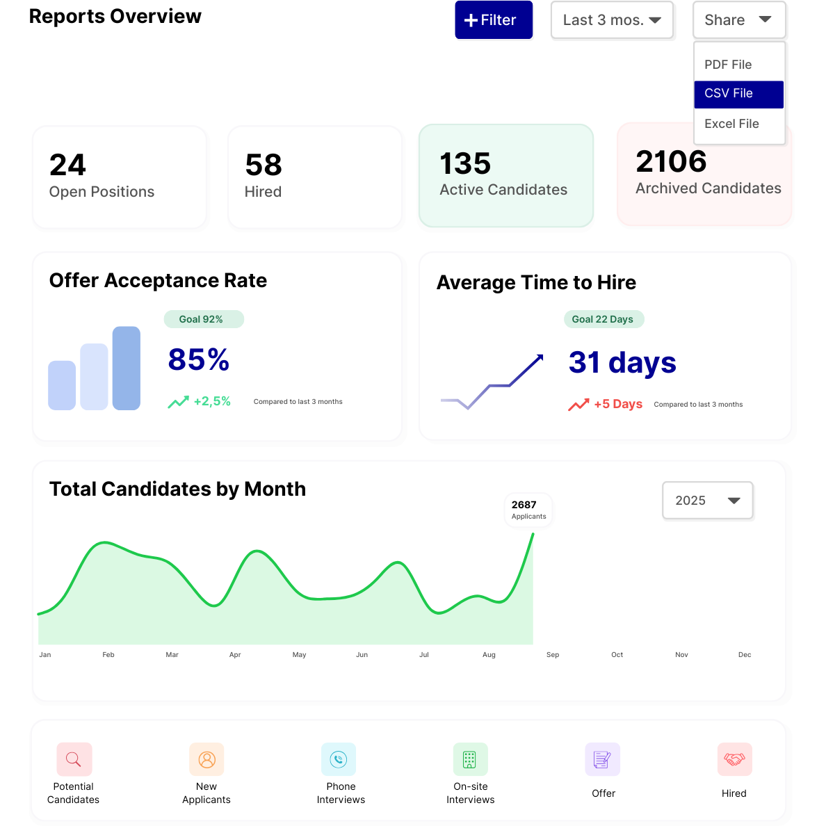 Get a clear view of your hiring pipeline with dashboards that reveal what drives success and where improvements are needed - no spreadsheets required.