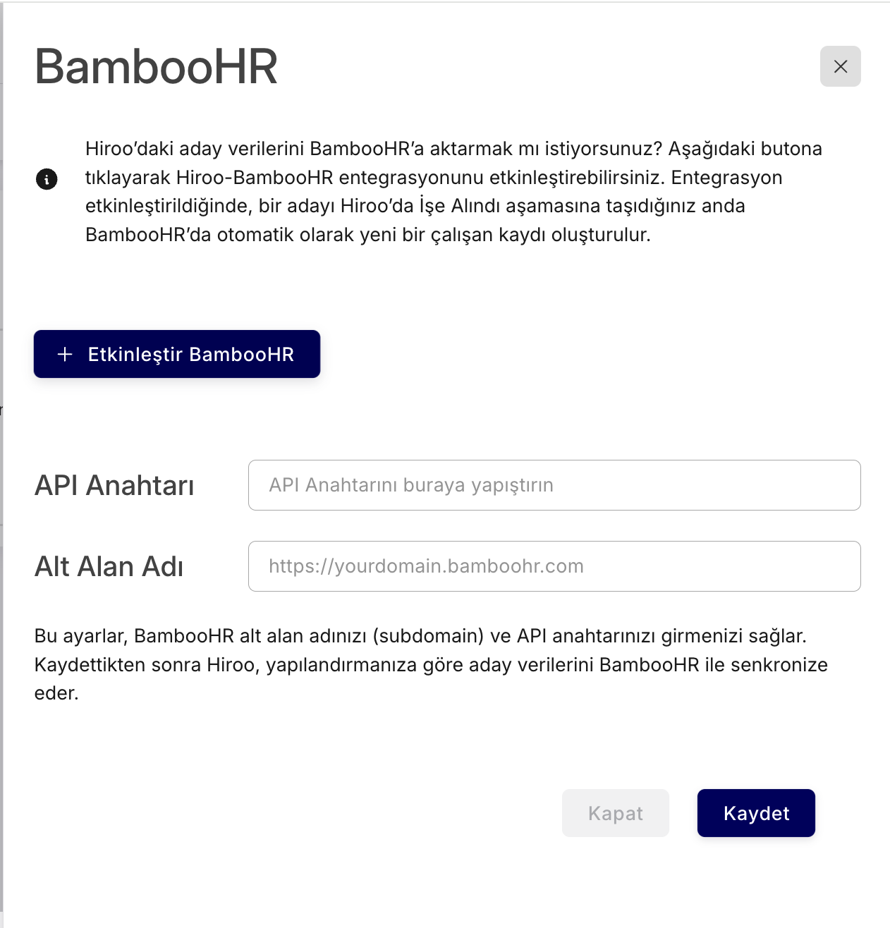 Adım 3: Hiroo’da BambooHR Entegrasyonunu Etkinleştirme